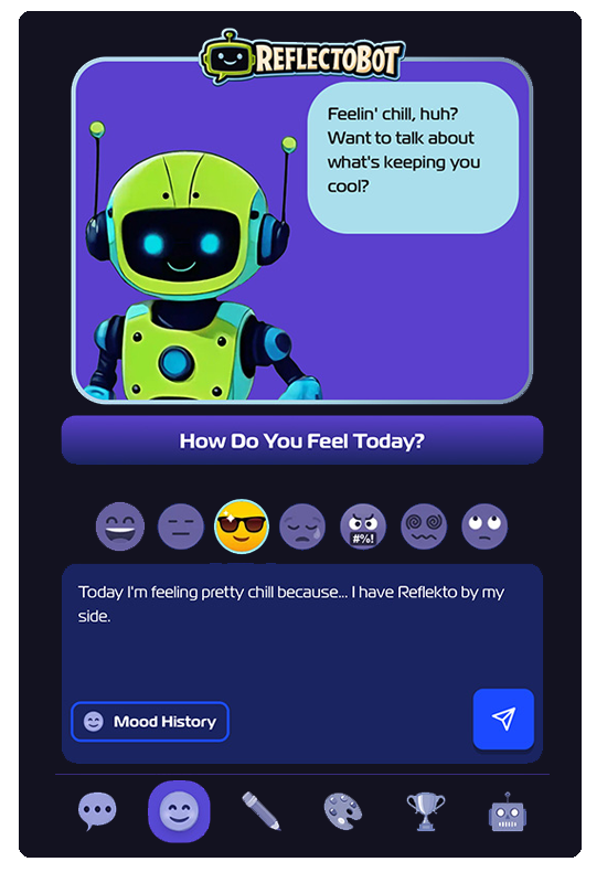 ReflectoBot is a friendly digital companion that helps kids explore their emotions, creativity, and resilience through fun daily activities.
